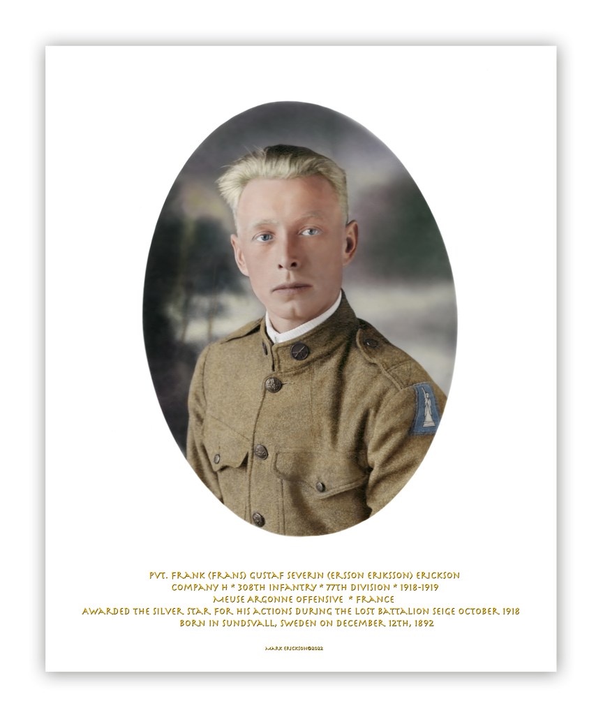 Frank G. S. Erickson February 3, 2023February 3, 2023 Written by markericksonstudio My Grandfather Frank Gustaf Severin Erickson 308th Infantry 77th Division American Expeditionary Forces Silver Star Recipient * Lost Battalion * October 1918
